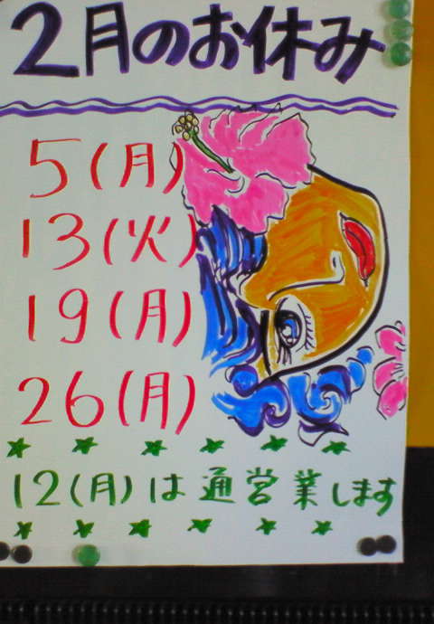 ワタシの大事な仕事の1つに、「今月のお休み」をポスターに描く、というのがあります。(←使い終わったカレンダーの裏) しか~もッ! ただの「お休み」ではなく、あまったスペースに「絵を描く」というのも必要なのです。(←勝手に描いてるだけ) 今月のお休みの絵はうまく描けましたッ! 見てくださいッ! 『ビックシオジェンヌ』の「ジェンヌちゃん」ですッ!(←名前知らない) ・・・これまで「ルパン」とか「ドンチャン」「ヤマサのカエル」「マリンちゃん」などさまざまな絵を披露してきましたが、今回の「ジェンヌちゃん」が一番好評でした。(←過去、「マリンちゃん」は「太っている」というブーイングが起こった) ・・・ふぅぅ このまま、エンパイヤでどんどん絵がうまくなり、どっかの画家さんからスカウトでもされたらどうしましょう・・・時給600円以上なら考えてもいいわ・・・ PR |