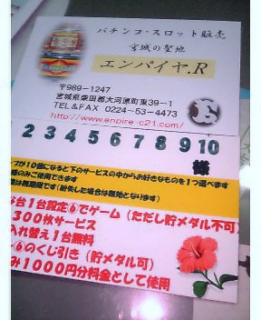 それは・・・・ 『お店のスタンプカードつくり』ですッ! パソコンが超苦手なワタシは、夕方から夜までかかって、一生懸命慣れない作業と格闘しました。 ・・・どうでしょうッ! この渾身のスタンプカードの出来はッ! サイフにも簡単に入れるように、名刺サイズにしてみました。 スタンプが10個たまると、『メダル300枚プレゼント』とか『1000円分の金券として使える』とかいろんなサービスの中から、好きなものが1つ選べるシステムです。しか~もッ 「有効期限」が無期限です。うっひょっ~ッ ・・・ど、ど、どれだけ苦労したか、このカード作りにッ(涙) たいていのお客様は喜んでもらっていって下さるのですが、あるつわものの常連客からは、「持ってると失くしちゃうから、俺のコインのとこに置いといて~」 と言われてしまいました・・・ おーいッ 持ってけよ~~ッ そしてサイフに忍ばせてッ! だってアタシがこんなに仕事したんだものッ!(←ふだん何もしてないから) 頼んでもダメで、結局そのお客様は自分で自分のコインの山にぶっさしてゆかれました・・・ ・・・ふっ・・・どうせアタシのスタンプカードなんてそんなもの・・・ ぬぉぉぉ~~ッ!(←金ちゃん?) 今後いらっしゃるお客様ッ! どうかカードは持っていってッ! お願いよぉぉぉ~~~ッ! PR |