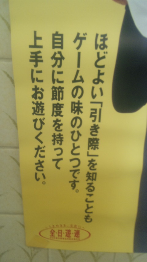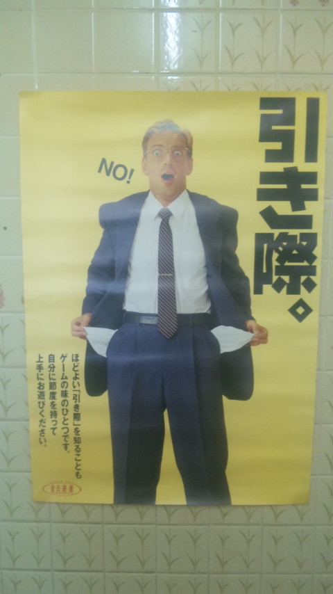 ええ、まずは↑を見てくださいませー・・・♪ 皆さん、彼を知っていますか? 彼は当店の男子トレイで、いつ何時も・・・『NO!』と、さけんでおりまっスル。 (名前は仮でマイケルです。実は名前募集中~・・・笑) で、↑これ。 マイケル(仮)の左下には、彼からのメッセージが・・・!? 『ほどよい引き際を知ることもゲームの味のひとつです。自分に節度を持って上手にお遊びください。』 とな。 う~ん・・・深い!深いメッセージですね~。 いや、別にこのメッセージを見なくとも、マイケル(仮)の『NO!』の一言で十分なんですがね・・・笑 パチスロ・パチンコファンの皆様、遊び方は百人十色でございますが・・・ よーするに、お金をかける以上・・・ ①店を選ぶ ②台を選ぶ ③台で遊ぶ ④やめる この一連動作を含めて、『パチンコ・パチスロ』って事ですな♪ と、いつもトイレで頑張って、『NO!』と言い続けてるマイケル(仮)に、出番をあげましたメカニックですた! ・・・ ・・・ はぁ・・・ ワタクシのパチ・スロ人生に、マイケル(仮)がもっと早く登場していれば・・・ もっと負けないですんだのに~・・・(じょー・・・(涙が滝のように流れる音)) PR |