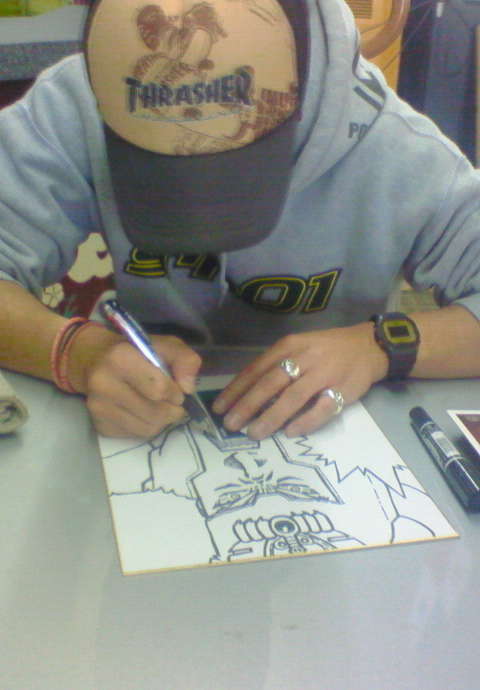 アニかつさんと ガル憎さんですッ! 遠くからもお客様がいらしていただいて、 当店としても本当にありがたいかぎりです。 「出待ち」みたいなのしてる方もいらして、 ワタシも改めてお二人の有名さにビックリデス。 お二人は始終、楽しそうに当店で遊んでいかれました。 サインや写真撮影にも気軽に応じていただき、 ワタシのような下っ端にも気軽に声をかけてくださる気さくな方たちでした。 アニかつさんは「ディスクアップ」で踊るし、 ガル憎さんは「北斗の拳」でなんかスゴイことやってました。 (このスゴイことの意味がワタシにはわからない・・・・) ファンの皆さまとも気さくに声をかけるお二人。 有名人だというのに、なんでしょう、この気さくさは。 中武一日二膳さんといい、 無道Xさんといい 「必勝ガイド」のライターの 方々はみなさまホントに良い方たちばかりです。 お客様にはお二人の「回胴魂Tシャツプレゼント」も! 「仕事休んでかけつけた」 「仕事ほっぽり投げてきた」 ・・・そんな方たちが多い中、 みなさま喜んでいただけたようで何よりです。 アレ、・・・ガル憎さんなんか真剣に描いてる・・・・ なんとッ!当店への特製プレゼントですッ! すばらしいッ! コレがホントの「画伯」・・・ 「こころ」までだっこしてもらいましたッ! よかったね! こころ! PR |
