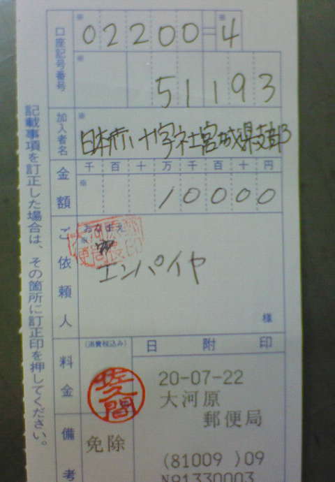 群馬の名店・オアシスさま、 そして当店による「3店合同ダービーイベント」。 参加費から「岩手・宮城への地震の被災者の方々へ 義捐金を送る」との主旨のもと、 楽しく行われた次第でございます。 当店からは20名の参加者が いらっしゃいましたので、 お一人様500円を義捐金として頂戴し、 合わせてちょうど1万円を募金してきましたッ! 募金なんてマトモにしたことないので、 ちょっとドキドキです。 大金を預かりながら郵便局へ行ったワタシ。 「娘っこに金を預けたら、 ユミリーの風水グッズに 化けるんじゃないか」 との一部からの 心配のお声があがりましたが、大丈夫ですッ! アタシが欲しいユミリーの 「風水トイレバスマット(黄色)」は もっと高いのですッ! 1万じゃ買えないのですッ! (なんならこっちも募金を・・・) 「日本赤十字宮城県支部」へ ちゃんと募金してきましたッ! ふうふう・・・ コレで責任は果たしたよ・・・ 昨日も夜中に地震があって、宮城は震度5! 震えてアパートで朝を迎えました。 (時計と趣味のアロマグッズが落っこちてきた) 被害に遭われた方々、大丈夫でしょうか。 当店は無事でしたが、 青森・岩手の方はもっとひどいようなので心配です。 一日も早い復興をお祈りしております。 当店からのわずかばかりの募金が、 被害に遭われた方々の お役に少しでも立てたら、 こんなうれしいことはありません。 つーか地震多すぎッ! も~いいかげんにしろよ地球! こえ~んだよ毎晩毎晩さああ! PR |