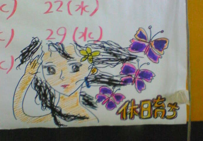 >蛾の毒々しさが妙にリアル 「蛾」じゃな~いッ!「蝶」よッ蝶ッ!バタフライ~ッ! >ライスさん >最後はオールキャストで 画伯の力を持ってしても、オールキャストはちょっと難しいですね~ >ひろきち7xさん >カウントダウン付きの日めくりにしてください。 ご提案とてもありがたいのですが、カウントダウンだと、「あと3日」「あと2日」とかなるのがとても寂しいので、今回はカンベンしてください。 >トルグラさん カウントダウンの日めくりカレンダーは、閉店日が近づくたびに寂しさがこみあげるので、私のわがままで違うのにさせてください。ごめんなさい。 >テルのパパさん >腕がヤバイ ありとあらゆる方から言われました。でも!画伯はまったく気にしてません。 >キュイン×2さん >いかにも飛ばなそうな蝶ですなぁ! 飛びます!飛びますって! >コキ男さん >スタッフの皆さんの似顔絵も交えてみてはどうでしょうか? メカニックや女将の似顔絵を描いたら、ぶっ殺されそうな気がします@@; >せきぐちさん >画伯の絵心の灯は消えないで欲しいです。 消えないですよ~今日も、ゲストでいらっしゃるマッパチのお二人の似顔絵を描きました。それはけっこう好評! 近日、お待ちしてますね! >SD2@返り討ちさん >歴代の絵をTシャツにプリントして、 歴代の絵はすべてカレンダーの裏にテキトーに描いて、終わったらビリビリ破いて捨ててます・・・・ >裏参さん >小さい画像で見ると意外とまともに見える。 府フ不不不負・・・・私のマジックにハマリましたね!?そうに違いない。 >CJさん >右手、変!!人間の曲がり方じゃない!! ほら、育子は想像上の人物だから、腕がぐねっと曲がっててもいいのですよきっと・・・・ >Flipperさん コレ、全然マシなほうですよ~ 先月の「ラオウ」があまりにもブーイングの嵐だったので・・・ 育子は美人に描きました☆ 【2008/10/0317:57】||娘っこ#56b87c0c0a[ EDIT ]