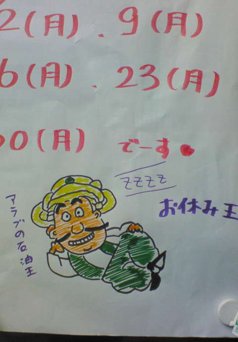 >少しずつ絵がうまくなっているように感じるのは気のせい? お褒めのコトバはありがたいのですが、私の実力はこんなもんじゃないです。だいぶ前のカレンダーに「ビックシオジェンヌ」の「ジェンヌちゃん」(名前しらん)を描いたときは絶賛の嵐でした。すご~く上手に描けたの~~◎ >トルグラさん なんだかよく分からないけど「アラブの石油王」と勝手に名前をつけました。常連のお客様に聞いてもさすがにコレの名前は知らんとのこと。「オヤジ」とだけよんでいるらしいです・・・・ >ケンヂへ(もう呼びすて) >これ七福神だろ! ち、違うよッ!アラブの石油王だよ・・・たぶん・・・ >キュインキュインさん >世相に合っている絵を描いてますね。 アレ、まったくそういうのは考えたことないですよ~ 「基準」は描くのがめんどくさいかどうかだけ。 >銀河のブルーさん >これ、競艇大好きえびすさん?? ちっ、ちがうよぅぅ~~上手に描けたね、って言ってくれた人もいたんだよぉ。・・・・それは「キングガルフ」が大好きな「あきぞうオジチャン」だけだけどね・・・・ 【2008/05/2416:25】||娘っこ#92cc791166[ EDIT ]