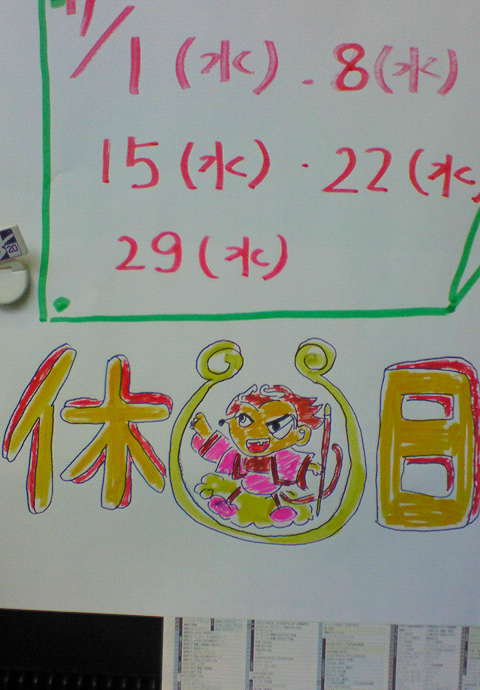 の「ゴクウ」ちゃんですッ! (名前知らん) ・・・ああ・・・・またしても画伯、いい仕事をしてしまったよ・・・・ ちょっぴりゴクウが「肉まん」の中に 入ってるように見えなくもないが・・・ ホレ、それは画伯一流の 「デフォルメ」ってヤツ?? (デフォルメのイミ間違ってる?) しかも今回は休みの日を 四角で囲むという斬新さ・・・・ (どこも斬新ではない) 描いてるうちに気づいたんだけど、 7月は連休があるのね~「海の日」がらみの。 連休中はきっとどこもかしこも アベックだらけだろうなぁ・・・ (ホントはボコボコにしたい) でも!いいもん! ウチにはかわいいかわいい オスの「こころたん」がいるもんッ! その日も一緒にお散歩しようね、ココたん! (この時こころは事務所で寝てましたとさ・・・・) PR |