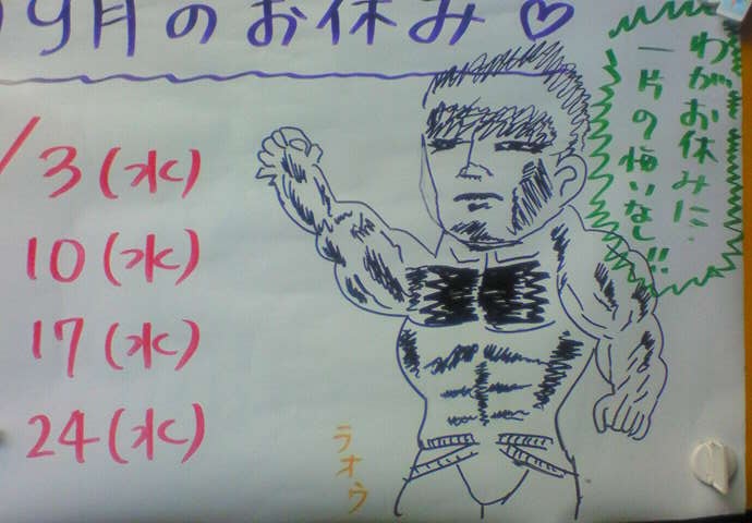 >でも「お休み」⇒「休日」の方がいいかな。 おお!その方がはるかにいいですな。さすがです。それは思いつきませんでした。何せラオウさま自身を描くので精も根もつきたので・・・・ >練馬のキャスバル改め所沢のマ・クベさん >次回は、「山のフドウ」をお願いします。 「北斗の拳」をちゃんと読んでないのでわからんがな。でも店にある台で覚えた「リン」と「ユリア」と「おいおい、置いてかないでくれよ〜」という「緑の髪の男の子」なら描けます。 >トルグラさん >何か記念に落書きしてもらおうかなぁ〜? フフフ・・・「画伯」はそう簡単に筆は取らなくってよ・・・(エラそう) 実はこう見えて私、「サイン」をしたことがあります。とてもエンパイヤを愛してくださる遠方からのお客様です。サインなんてしたことないので「娘」とだけ書いておきました・・・・ >ひろきち7xさん >みんなから寄せられたコメントを書き添えてはいかがですか。 「5歳児が描いたみたいだ」という声もあがりました。非難の嵐がとても多かったので、とてもコメントを書き添えるスペースがありません・・・・ >ライスさん >今度の日曜日にこの絵を見に行きますか(^^)/ 日曜日は午後以降〜でないとシフトに入っていないのです。それでもいらしていただけるなら、お会いできるのを楽しみにしております! >鷹着さん >結構、大変なんですよね!?題材とキャラを選ぶのは。 鷹着さんにも一度描いていただきましたもんね!題材選びも大変なの分かっていただけてウレシいです。「描けるもの」「スロ関係のもの」「セリフがアレンジできるもの」・・・・誰も見てないお休みカレンダーにここまで力をいれるオレっていったい・・・・ >Flipperさん >記念にフリッパーの絵でも描いてもらおうかなぁ・・・いや、やっぱいいや(爆 ああ、描けますよ!「イルカちゃん」の絵なら以前描いた事あります!どうぞご遠慮なさらず〜(あ、いらないって?) >CJさん >明日行ったときに詳しい話をしましょうか・・・^^; 明日の土曜日は午後6時以降でないと出社できないんですよ〜それまでお店にいていただければありがたいのですが・・・ >裏参さん >上半身はちゃんと描いてるのに対し実にあっさりした下半身… 上半身を描くのに力つきた、ということです。特にギャランドゥあたりは精魂込めましたからね!「黒王」リクエストっスか・・・・もうこのカレンダー、捨ててしまいたいのでダメでしょうか??? 【2008/09/0605:56】||娘っこ#56b87bf2b7[ EDIT ]