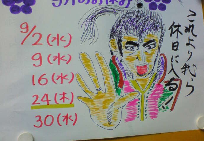 フーッ・・・・今回は画伯、力を入れましたよッ! なにせ20分もかかってますからねッ! 以前から描きたかった、でも難しくて(負けすぎて)描けなかった 愛しの「前田慶次」さまで~すッ! 百万石の酒もそりゃ飲みますわなッ! しかも、今回の力の入れようは、 前田殿だけではないのです。 よ~く上の方をご覧ください・・・・・ そう!「前田家の家紋」入りで~すッ! しかしさすが原哲夫先生、黒の影(シャドウ)が多いよ・・・・ もう角田信朗の唄まで聴こえてきそうなこの絵を、 今月のカレンダーとしま~すッ! PS 9月は連休が入るので、 23(水)は通常営業します。 代わりに24(木)が休みとなりますので、 お気をつけくださいね♪ PR |