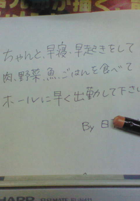 常連様から借りたマンガはキチンと読んで返す(←感想もつける)、トイレットペーパーはキチンと▽にする、1人暮らしなので食費を節約する為、お菓子のみで1日を過ごす・・・などなどアルバイトの鏡のような子だと思っています。 ・・・でも、そんなワタシにも致命的な弱点があります。それは、 「遅刻をすること」 です・・・ ワタシが一人で朝番の時などは、10時ジャストに開店したことはないに等しい。お客様を外に待たせたこともしばしば・・・ 今日も、40分遅刻して当店に着きました。 汗だくになって遅れてきたワタシの机の上に、こんなメモが置かれていました。 ・・・常連のお客様からの生温かいメッセージです・・・ うううッッ~~~アタシなんて、こんなアタシなんて死ねばいいのよオオオオオ~~~ッ 誰か「遅刻」をしない方法を教えてください。このままではマジメにクビになってしまいます。 きっと当店にはワタシが必要なハズ・・・(←今、店主が「そうでもないよ~」て言った!!!) ち、遅刻さえ、遅刻さえしなければ・・・あの目覚ましめェェェ~~ッ・・・あのいまいましい目覚ましがちゃんとワタシを起こしてさえくれれば~~~ッ! 誰か、ホントに、朝きちんと起きられる方法を教えてください。 代りにワタシが「仕事の上手なサボり方」を教えます。 PR |