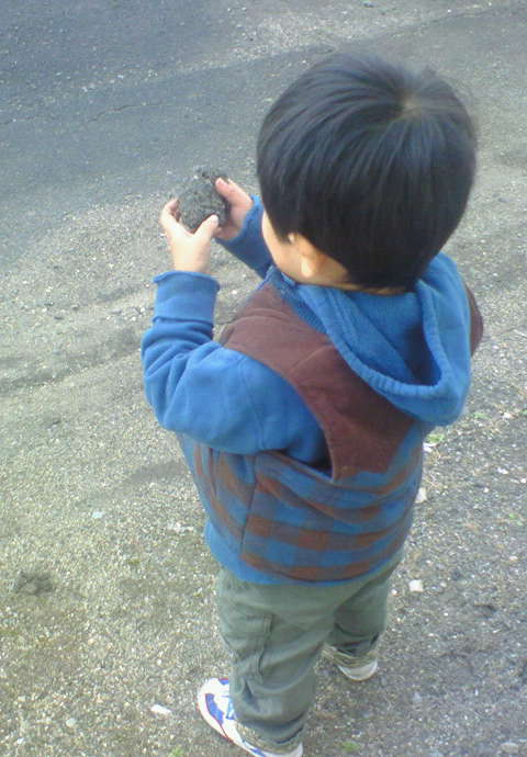 今日は、常連のお客様が連れてきたちびっ子(2歳)と「小石なげ」をして遊びました。