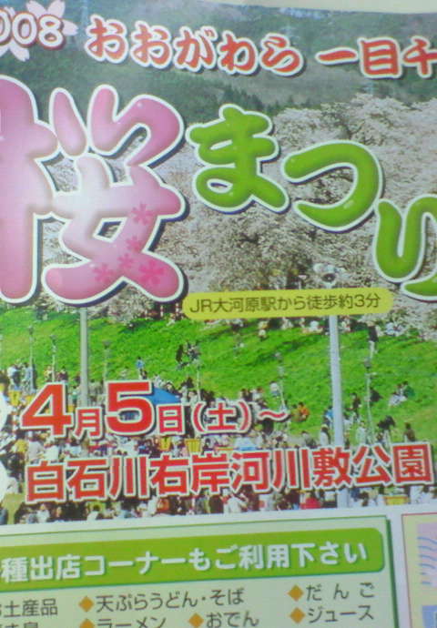 ここ宮城県の大河原ではこれから桜が咲きます。 唯一といっても過言ではないほど 大河原が一年を通して栄える時、それが今。 「桜まつり」がはじまりま~すッ! 「金八先生」みたいな土手がず~っとつながってて、 そこに桜並木があって、夜はライトアップとかされて、 ダンゴ食べれたりビール飲んだりできるのですッ! ダンゴ・・・・ビール・・・・ (店主へ)み、みんなで、スタッフみんなで行きませんか? それに何より、今年はこんなチラシを見つけました。 「人力車運行」 の、の、乗りたいッ! コレに乗りたいッ! 人力車乗りたいッ! 桜並木の下を人力車で通るワタシ・・・・ ああ、なんて絵になるの・・・・ 「もっとスピード出して~~ッ もっとびゅー~~~んとッ!」とかいいそうですが、 桜まつりの期間中、絶対乗ってこようと思いますッ! (店主へ)あ、あの~~・・・休みもらっていいッスか??? PR |