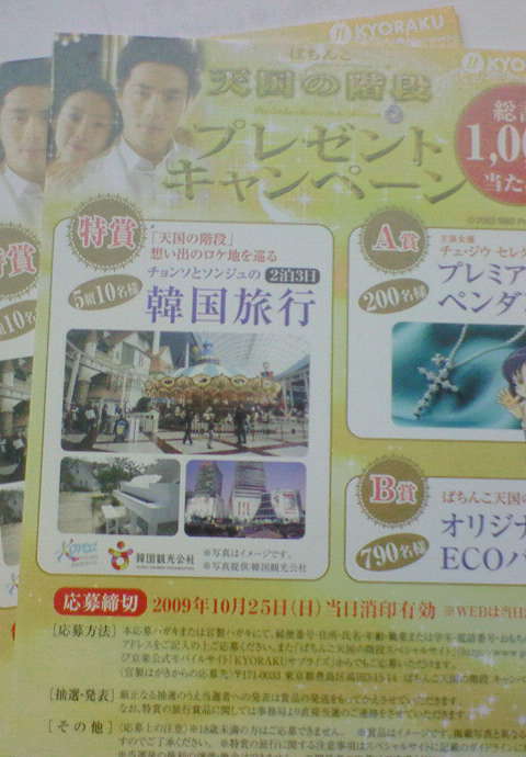 ひょっとして今日は25日(日)?????? はうぅうううううううう~~~~~~~ッ 今日、ぱちんこ「天国の階段」の 懸賞ハガキプレゼントの締切日だったよォォォォ~~~~ 女将がホールから懸賞ハガキを12枚も持ってきて、 「ハイ、アンタ、書いといてね」 と渡されていたのだったのにィィィィ~~~~~ 当たったらあかすりエステ行って~、カルビ食って~、 IKKOさんオススメの韓国コスメも買ってくるの♪ 2位の「チェ・ジウ セレクトのプレミアムペンダント」はな~ イマイチいらねんだよな~~ イヤ、かわいいんだけどアタシがアクセサリーとかあんまししないからな・・・・・オークションで出すとか? 3位は「天国の階段 オリジナルエコバック」 これ問題外ね。いらないね。 でもこーゆーのに限って当たっちゃうんだよね~~~・・・・・ 「天国の階段」見てないんだけど、面白いのかしら??? でも「韓国旅行」が当たったらいいのになぁアアアア~~ 最近どこにも行ってないしなぁぁぁ~~~~ 「天国の階段」の思い出のロケ地を巡る、とかってあるけど、 見てなくても楽しめるのかなぁぁ??? ああ~~~当たるといいなァア~~ 注:締め切りはとっくに終わり、この妄想女はハガキを出してすらもいません PR |